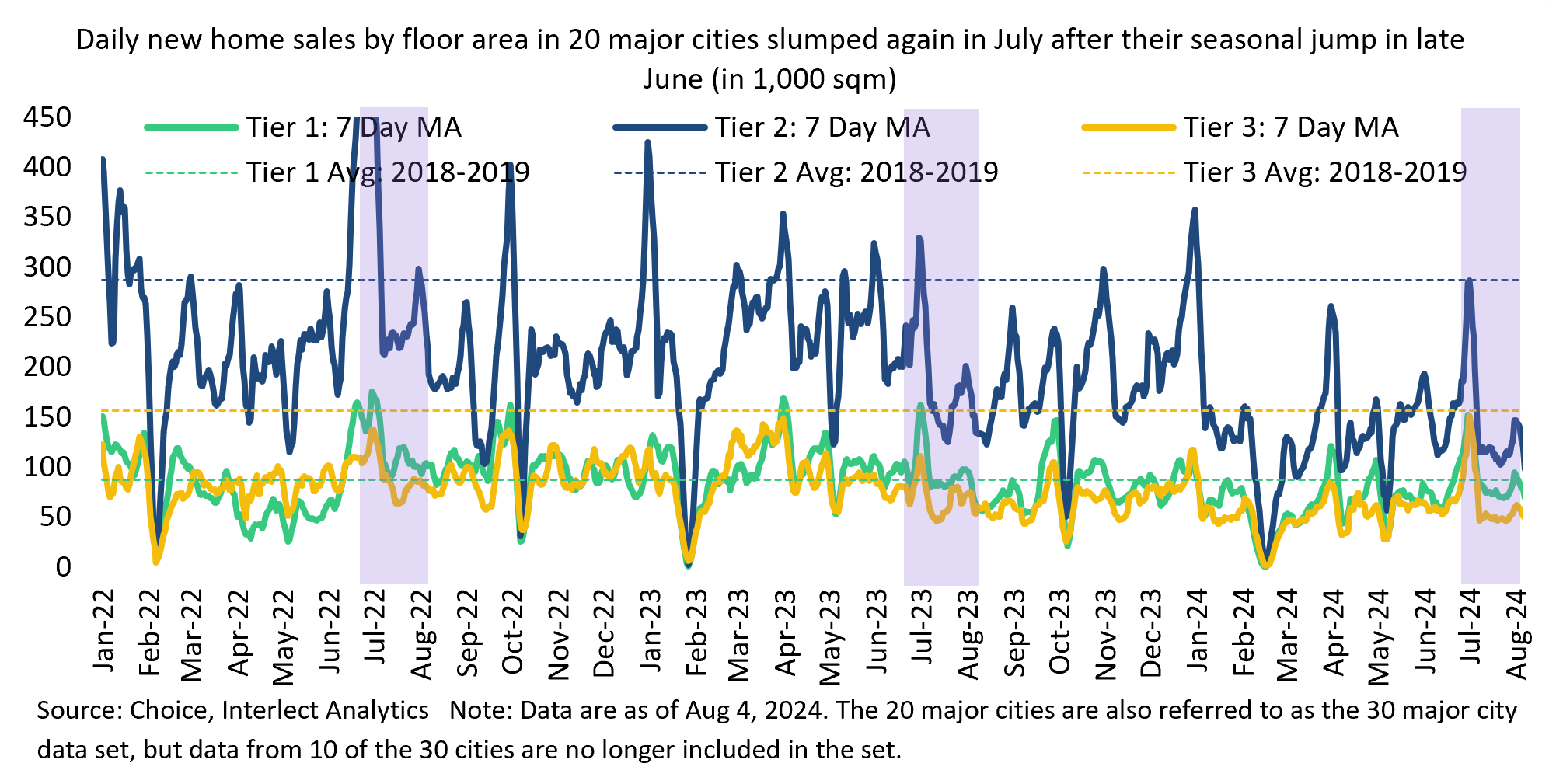 New home sales fell sharply in July, based on high-frequency data from 20 major cities, following a seasonal jump in the second half of June. In DeepDive: Data Dump June 2024, we argued that the June data should be taken with a pinch of salt, as the increase appeared to be primarily driven by seasonal factors.